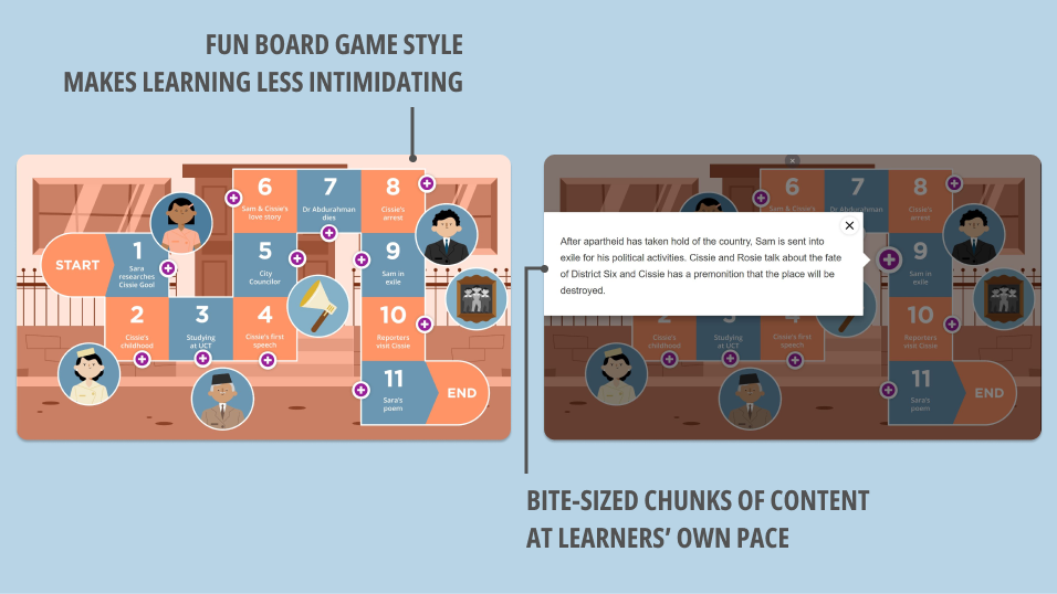 To summarize the events of the play, learners used this interactive board game. Although features were limited, it made learning a lot more fun and accessible.