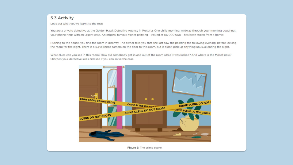 One of the texts learners have to write is a report. To practise, they were given a fun scenario as a detective and a curious puzzle. Can you work out who stole the Monet?