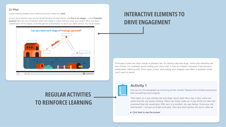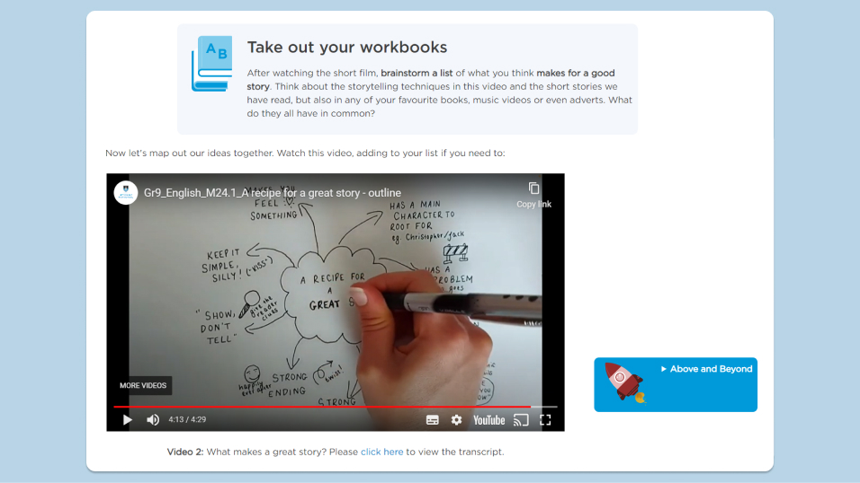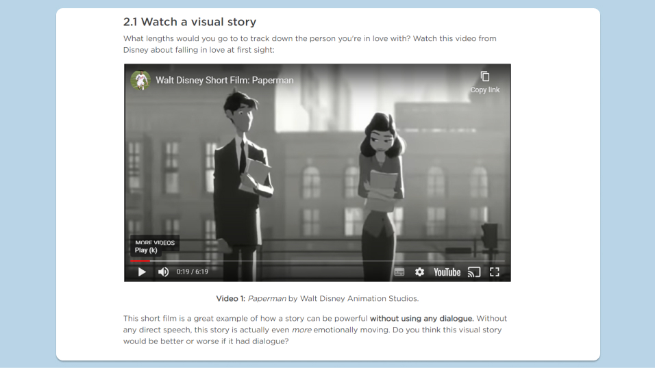 The Pixar example becomes a launchpad to thinking about the features of a story. In a low stakes brainstorm activity, the learners try to pin down what a story actually is. This encourages independent thinking. They then consolidate some of their ideas in a short video.